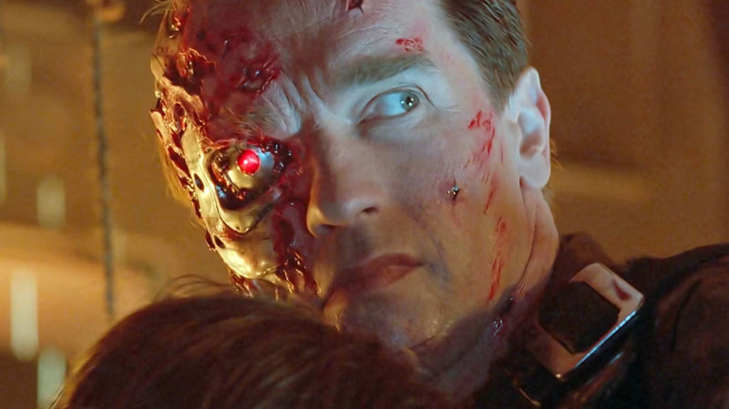 שמונה שנים אחר כך — מתוך רצון להחזיר את שוורצנגר לתפקיד הראשי, אחרי שהוא כבר לא רצה לגלם נבלים — הבין קמרון שתסריט זה כמו תוכנה: האדם שכותב אותה קובע את אופייה, והוא החליט שאם הרובוט הרצחני מהעתיד יתוכנת להגן ולא להרוג, זה מה שהוא יעשה. המכונה לא רעה בפני עצמה, היא רק מתוכנתת ככה. וכך הטרמינייטור הפך מאז מנבל לגיבור, ממחסל, למגן. רובוט אחר, מתקדם ומשנה צורה, הפך להיות האויב שלא יעצור, ולא יישן, ולא יאכל, רק ידהר קדימה למלא את משימתו.